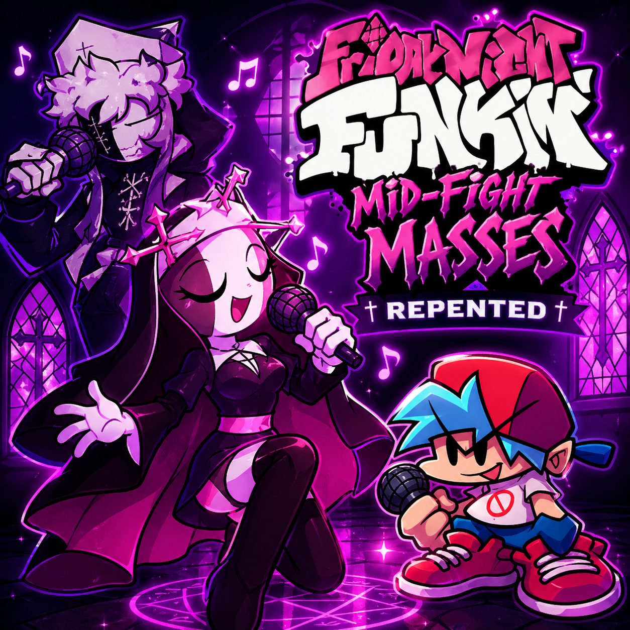 FNF Mid-Fight Masses: Repented is a remake of the popular Sarvente mod, focusing on improving the overall experience rather than changing its core. The familiar church setting remains, but visuals, animations, and sound have all been noticeably upgraded. As a result, it feels smoother and more modern compared to the original, while still keeping what players remember. This version suits both returning players and those who want to experience it again with better quality.