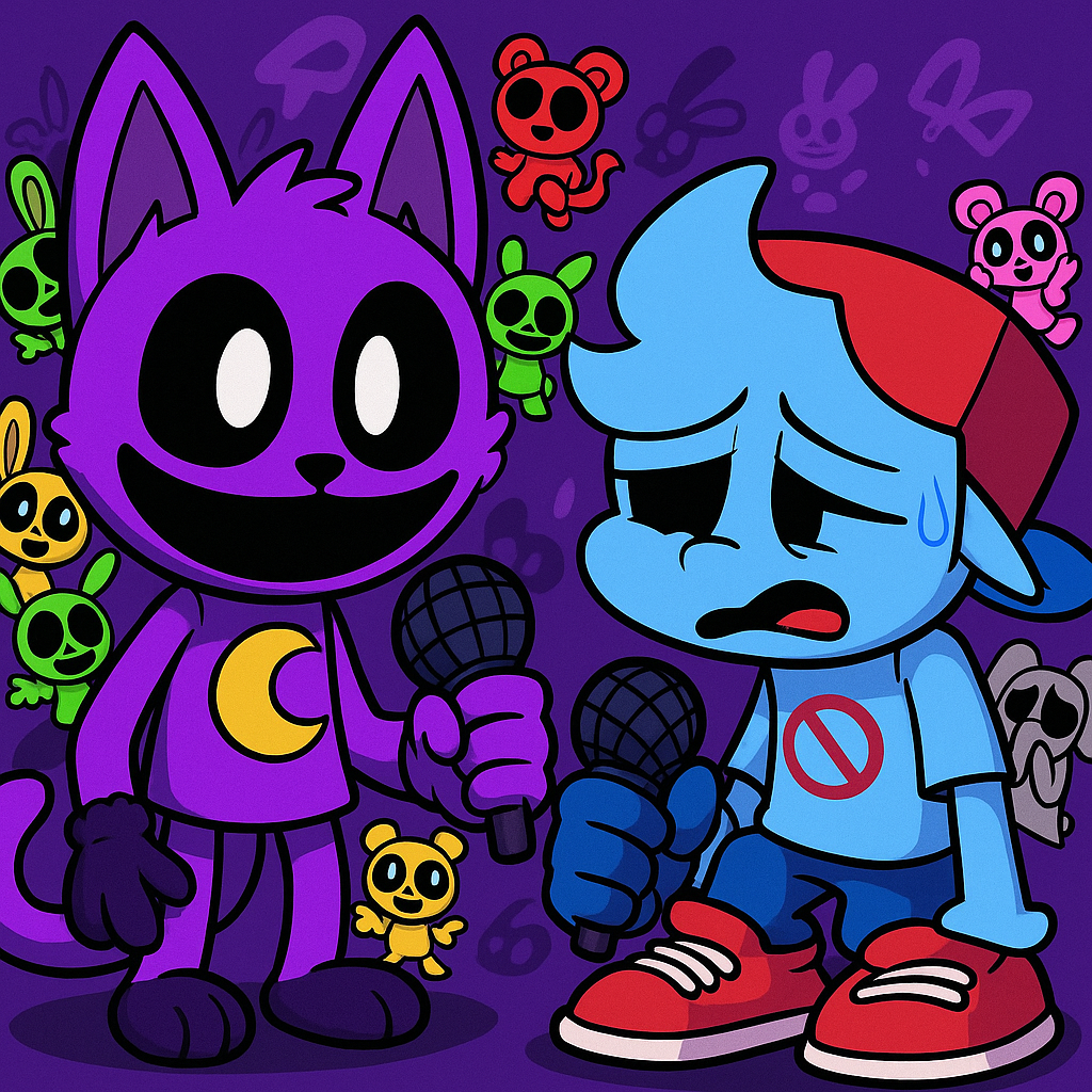 A dark world opens up again as FNF Vs. CatNap V2 puts players into a terrifying confrontation between Rapper-Roo and the deformed Critters from the Smiling Critters Factory. Dare to step into this sonic nightmare?